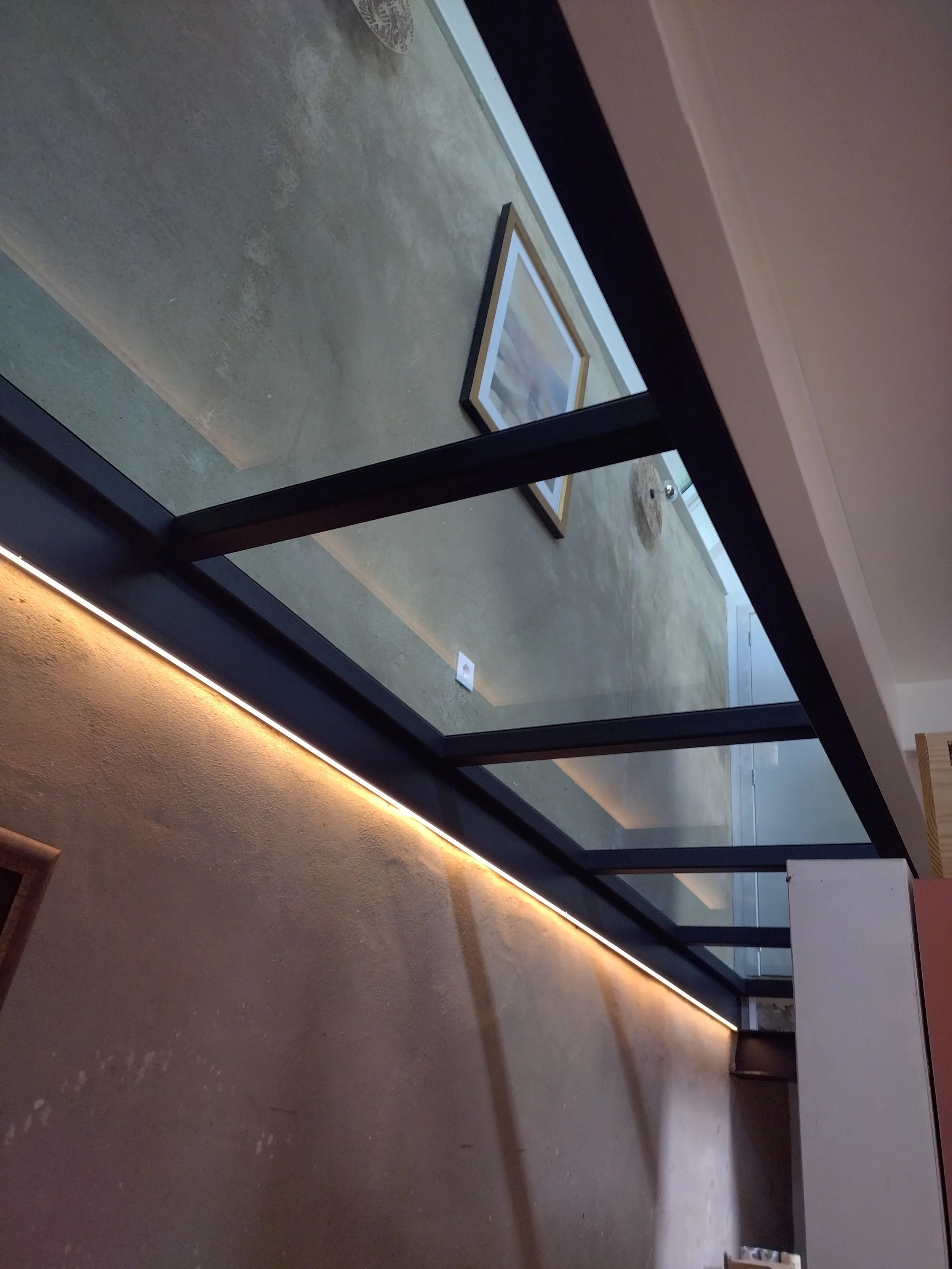 Création d’une passerelle vitrée et de garde-corps vitrés au sein de la ferme de Himbe, intégrant une charpente métallique conçue pour s’harmoniser avec le bâti existant tout en offrant transparence et sécurité.